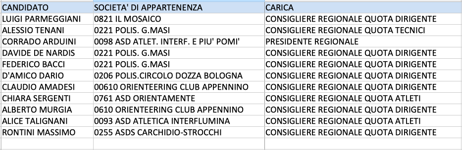 BOLOGNA: Di seguito i candidati dell’Assemblea Regionale Ordinaria Elettiva Comitato Emilia Romagna. "E' tutto confermato - precisa Arduini - Il 15 novembre a Colorno (PR) nel primo pomeriggio si terrà la votazione. Il Comitato sta crescendo, siamo diventati 15 società e puntiamo alle 20. Speriamo di farcela.".