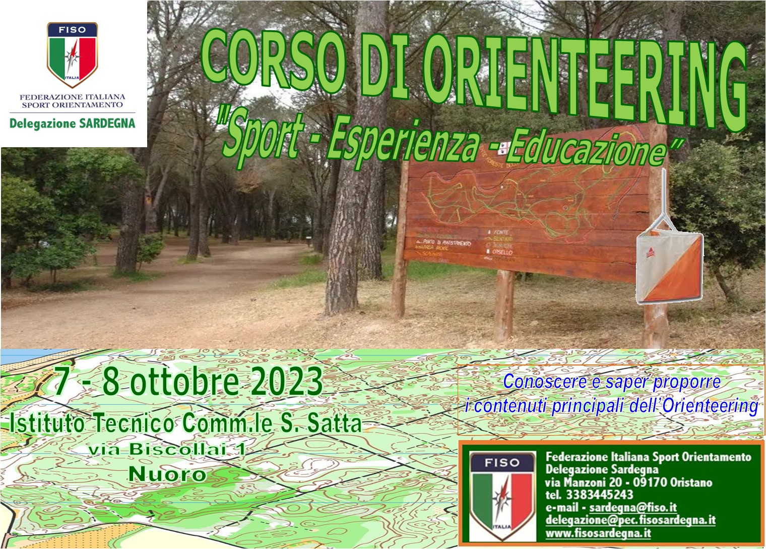 La Delegazione mette a disposizione i tecnici FISO nonché l'organizzazione logistica. Gli incontri si svolgeranno presso l’Istituto Tecnico Commerciale “Salvatore Satta” per la parte teorica e quella pratica nel parco adiacente con il seguente orario: sabato 7 ottobre ore 9.00 - 13.00 e 14.00 – 19.00 domenica 8 ottobre dalle 9.00 alle 14.00.