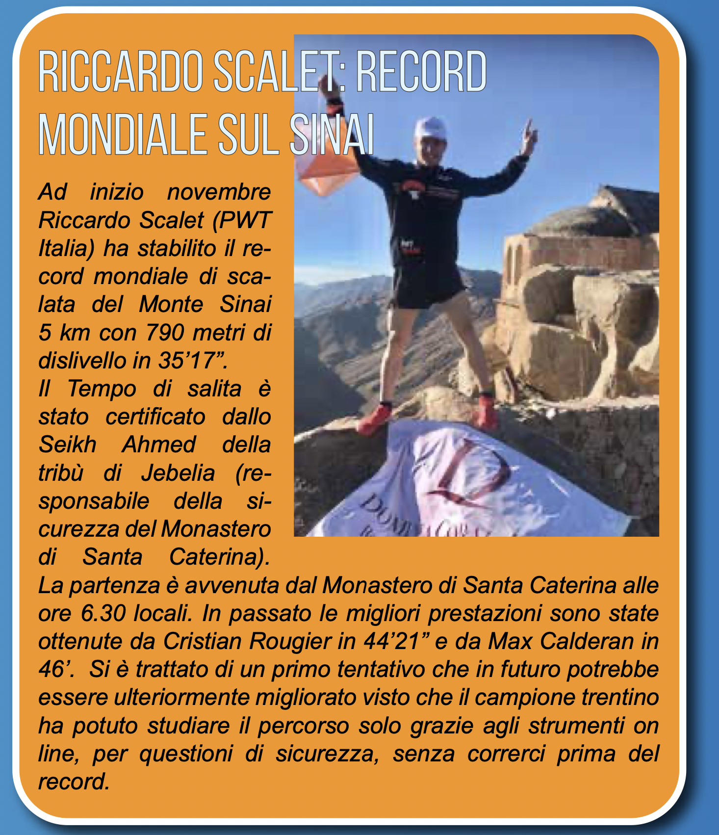 EGITTO: In passato ci era riuscito anche Riccardo Scalet (nel 2020), ora tocca all'azzurra Jessica Lucchetta che ieri ha scalato il Monte Sinai con un tempo record. Per Lucchetta si tratta infatti della miglior prestazione mondiale femminile (45’43”). Dietro di lei Annarita Scalzotto con un tempo di 53’50”.