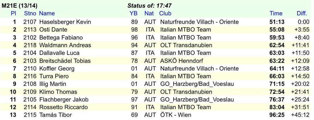 Giornata no per gli altri azzurri che non hanno trovato feeling con il bosco ungherese compiendo molti errori. Assente Antonio Mariani, infortunatosi al polso dopo una caduta in allenamento.